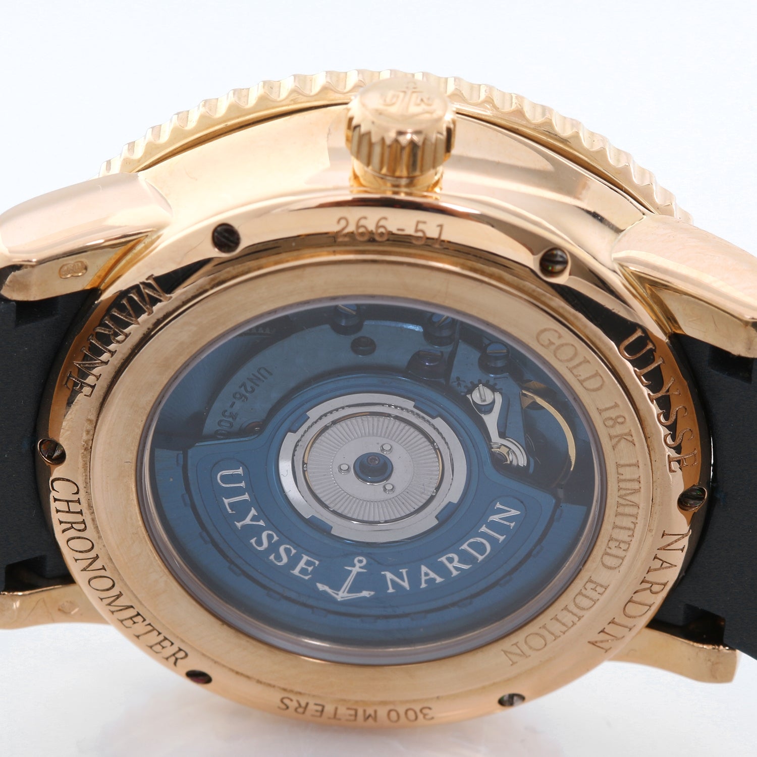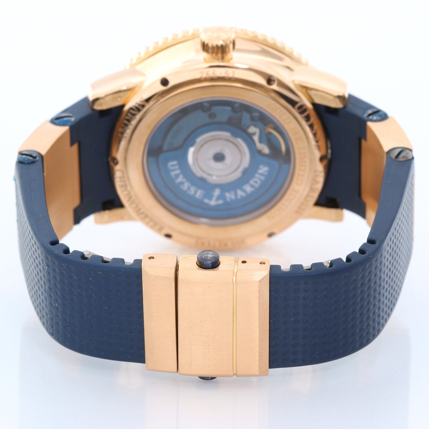 Ulysse Nardin Marine 18K Rose Gold Watch - Automatic; power reserve. 18K Rose Gold ( 40 mm ); Rotating bezel. Blue dial with stick hour markers; sub dial at 12 o'clock and 6 o'clock; date at 6 o'clock. Blue rubber strap with 18K Rose Gold double deployant buckle. Pre-owned with Ulysse Nardin box and papers.