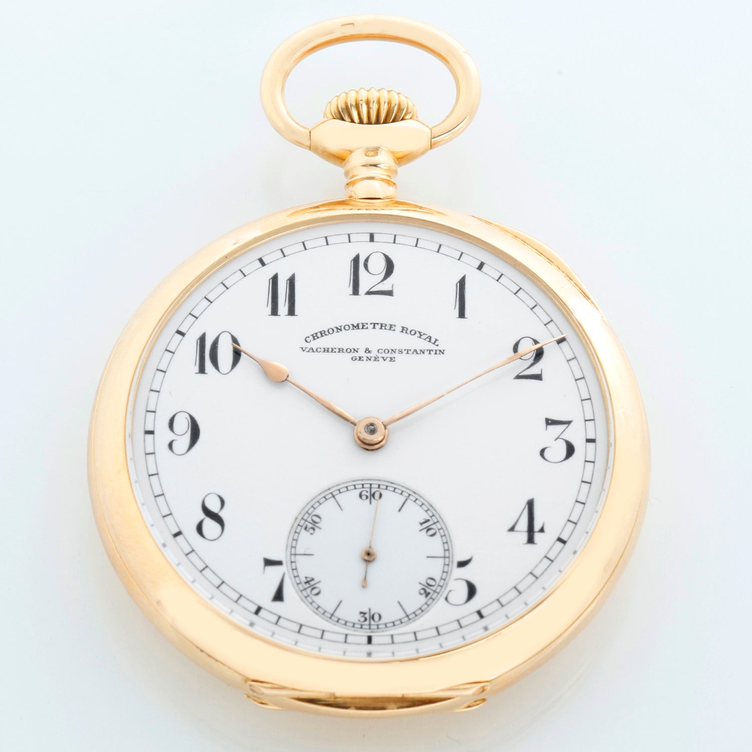 Vacheron Constantin Chronometre Royal 18k Yellow Gold Pocket Watch - Manual winding. Chronometre Royal. 18k yellow gold case with initials on caseback (47mm). White dial with Arabic numerals and sub second dial at 6 o'clock. Pre-owned with DeMesy box. Circa 1915.