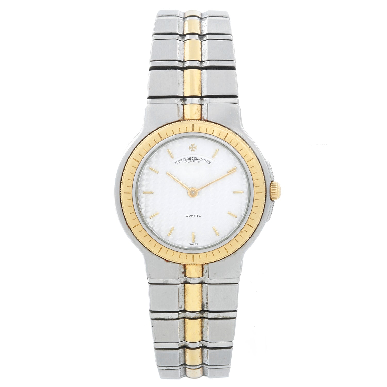 Vacheron Constantin Ladies Phidias Watch - Quartz. 18K Yellow gold and stainless steel (28 mm). Textured ivory dial with gold stick hour markers. Two-tone link bracelet. Pre-owned with Vacheron box and papers