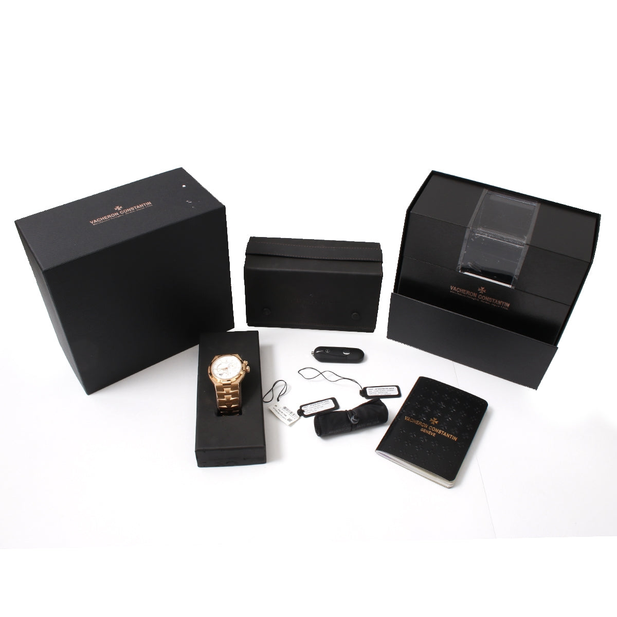 Vacheron Constantin Overseas 18K Rose Gold Watch - Automatic with power reserve. 18K Rose Gold ( 42 mm ). Silver-white dial with index hour markers, power reserve indicator at 9 o'clock, date calendar at 2 o'clock, dual time zone indicator at 6 o'clock, day/night indicator at 7 o'clock. 18K Rose Gold bracelet. Pre-owned with 2gb usb flash drive containing instruction manual and Vacheron Constantin box and papers