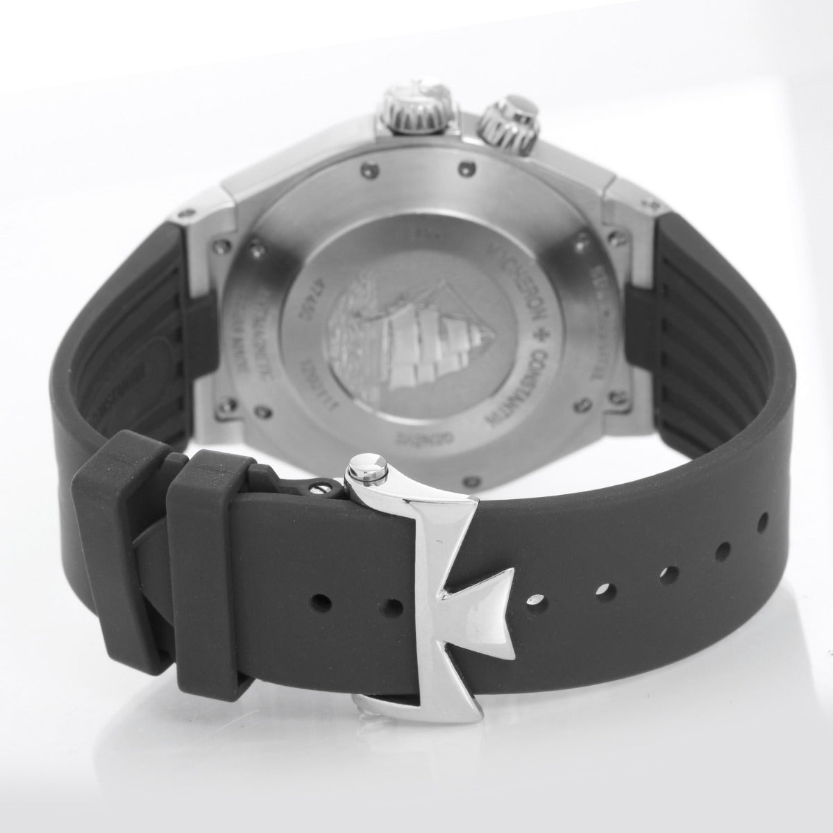 Vacheron Constantin Overseas Dual Time Silver Dial Mens Watch 47450 - Automatic. Stainless steel & Titanium ( 42 mm ). Grey dial with stick hour markers and power reserve indicator. Gray Vacheron rubber Strap with Vacheron clasp. Pre-owned with Vacheron box.