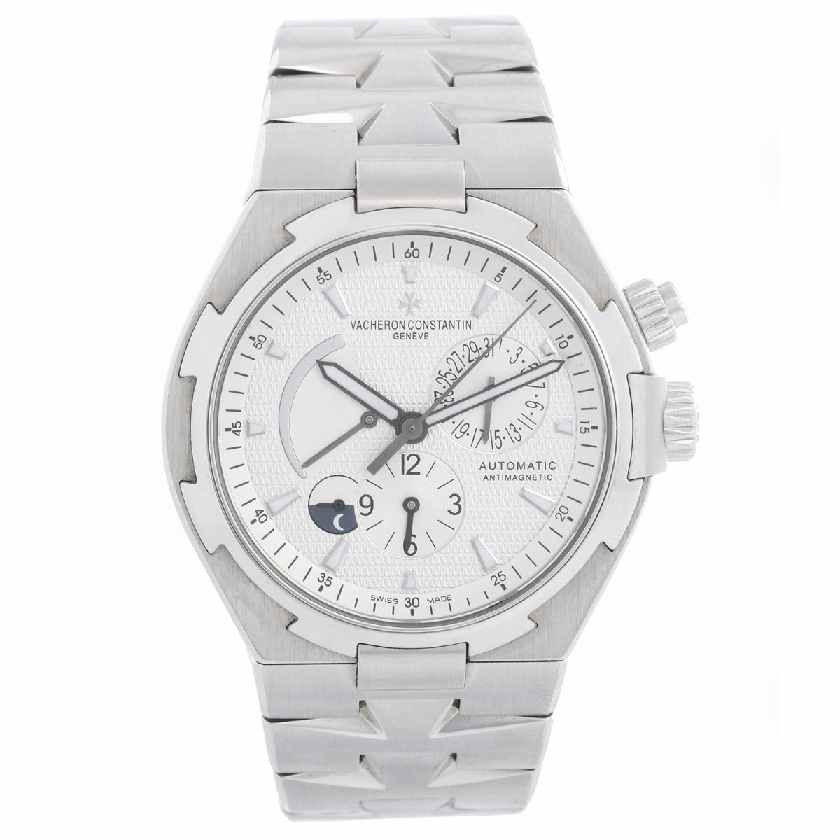 Vacheron Constantin Overseas Dual Time Silver Dial Mens Watch 47450 - Self winding. Stainless steel ( 42.5 mm ). Textured silver dial with stick hour markers and power reserve indicator. Stainless steel Vacheron Constantin bracelet with double folding clasp. Pre-owned custom box.