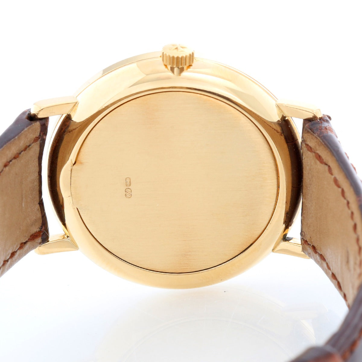 Vacheron Constantin Patrimony 18K Yellow Gold Ref 39039-2 - Manual winding. 18K yellow gold ( 32 mm ). White dial with Roman numerals. Strap band with 18k white gold Vacheron Constantin clasp. Pre-owned with Vacheron Constantin box. Circa 1980's.