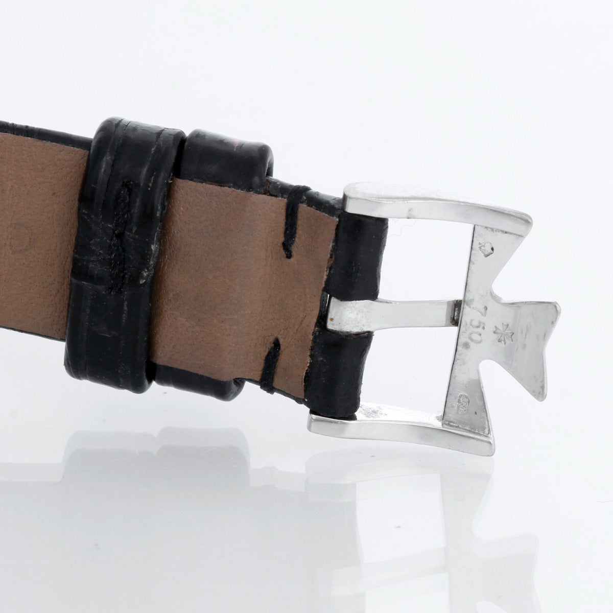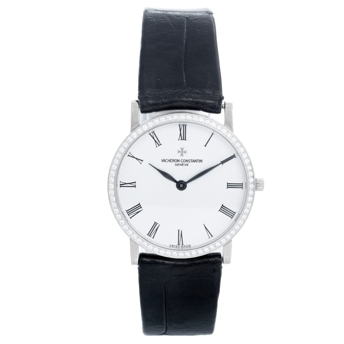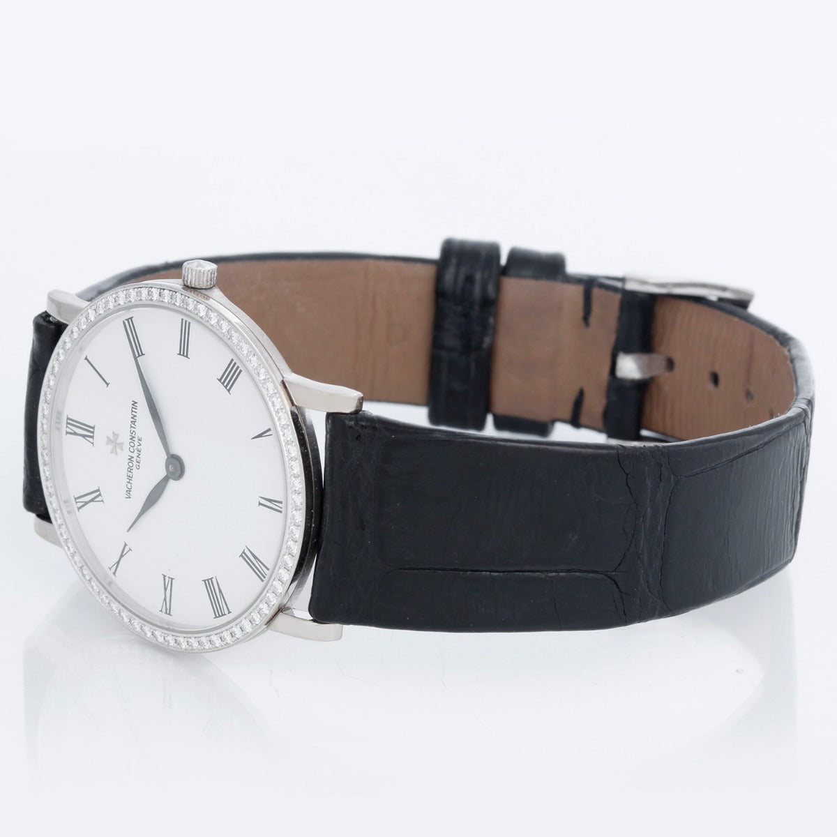 Vacheron Constantin Patrimony White Gold Diamond Ultra Thin Watch 33093 - Manual winding, Sapphire crystal. White gold case (31mm) with factory diamond bezel. White dial with roman numerals and oxidized gold feuille hand. Black Vacheron Constantin strap with Vacheron buckle. Pre-owned with Vacheron Travel box.