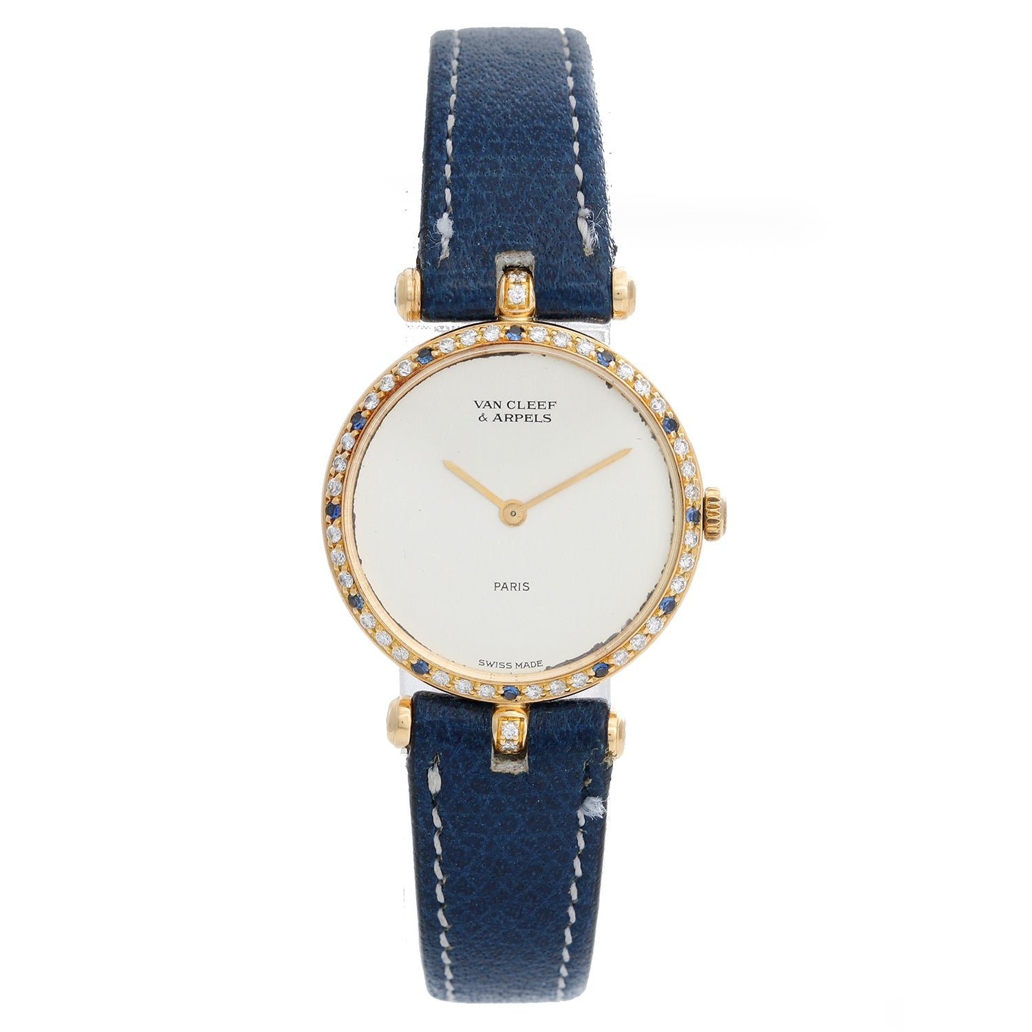 Van Cleef & Arpels Classic Yellow Gold Watch - Quartz. 18K Yellow gold with Diamond and Sapphire bezel ( 24 mm ). Silver dial. Blue leather strap with tang buckle. Pre-owned with custom box .