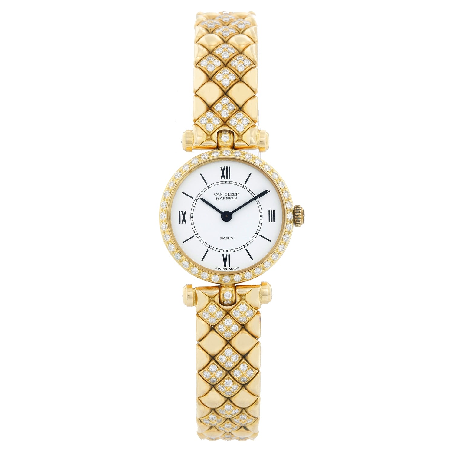 Van Cleef & Arpels Classique Paris Ladies Watch 18901B1- Quartz. 18K Yellow gold with diamond bezel ( 20mm ). White dial with black numerals . 18K Yellow gold diamond bracelet with double deployant buckle; Will fit up to a 5 3/4 inch wrist . Pre-owned with custom box.