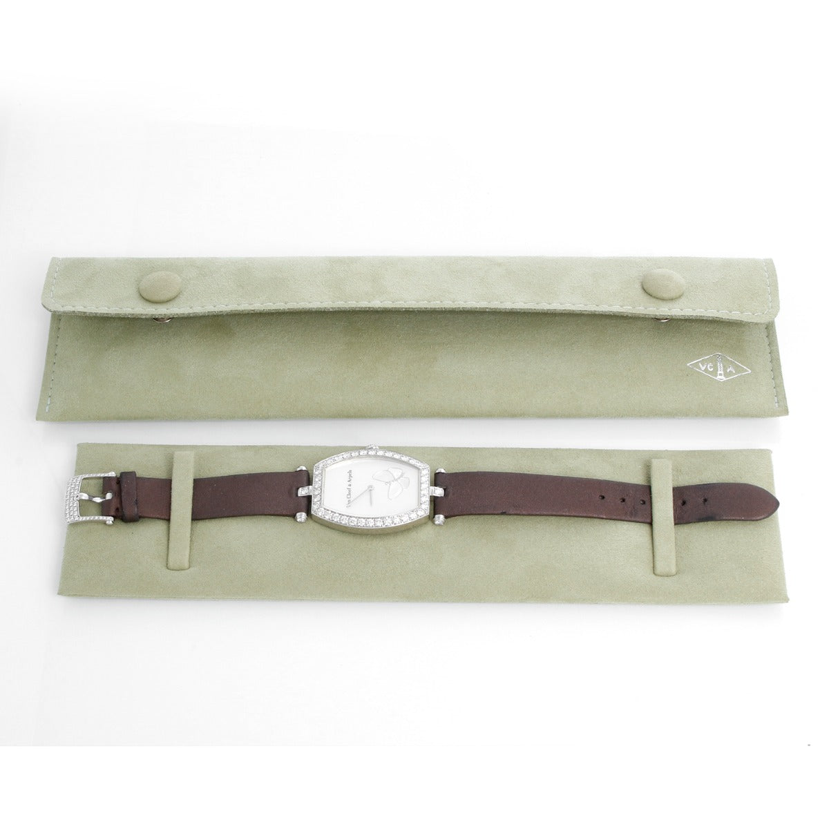 Van Cleef & Arpels Lady Arpels 18K White Gold Papillon Tonneau Watch - Quartz. 18K White Gold tonneau case with diamond bezel ( 26 x 33 mm). Mother of pearl dial with Mother of pearl butterfly with diamonds. Van Cleef & Arpels Strap with Van Cleef & Arpels 18K White gold pave diamond buckle. Pre-owned with Van Cleef Pouch.
