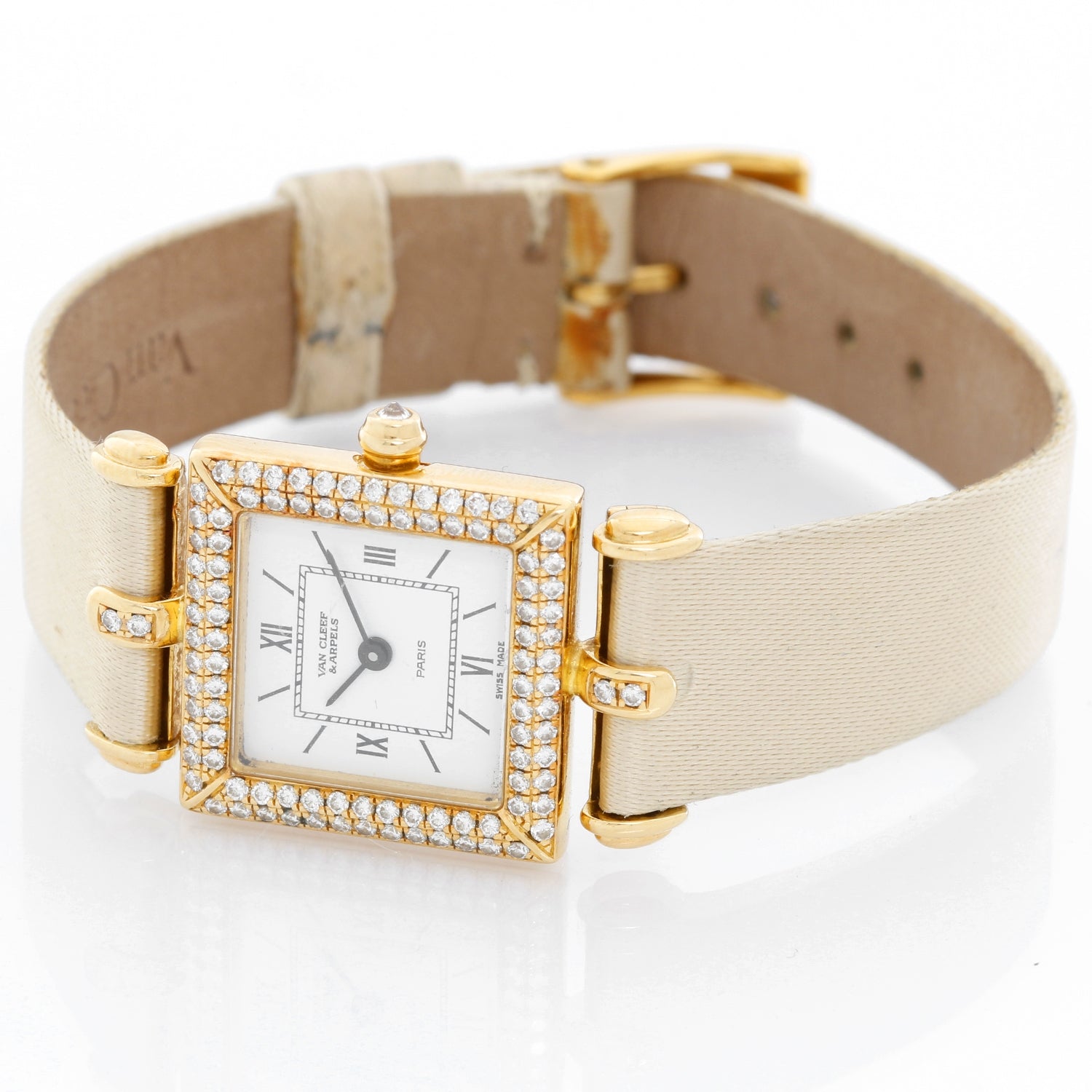 Van Cleef & Arpels Quartz Yellow Gold Watch - Quartz. 18K Yellow gold case with a double row of diamonds ( 20 mm ) . White dial with Roman and stick hour markers . White satin strap . Pre-owned with Van Cleef & Arpels box .