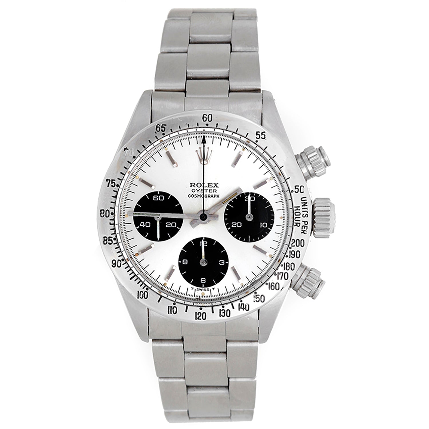 Very Collectible Rolex Vintage Cosmograph/Daytona Model 6265 - Manual winding chronograph. Stainless steel case. Silver dial with black subdials. Stainless steel Oyster bracelet. Serial # 3821914 - Pre-owned with box. Very collectible!