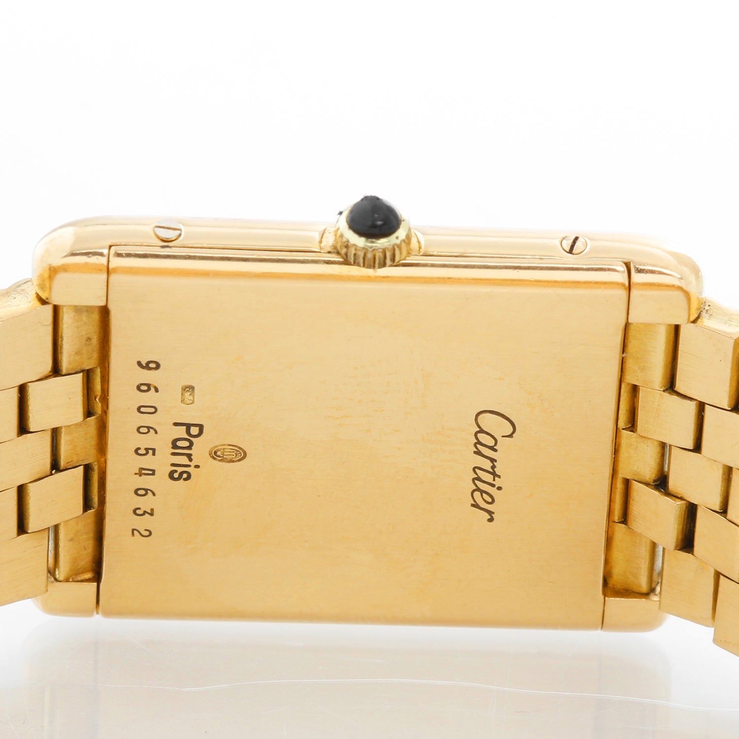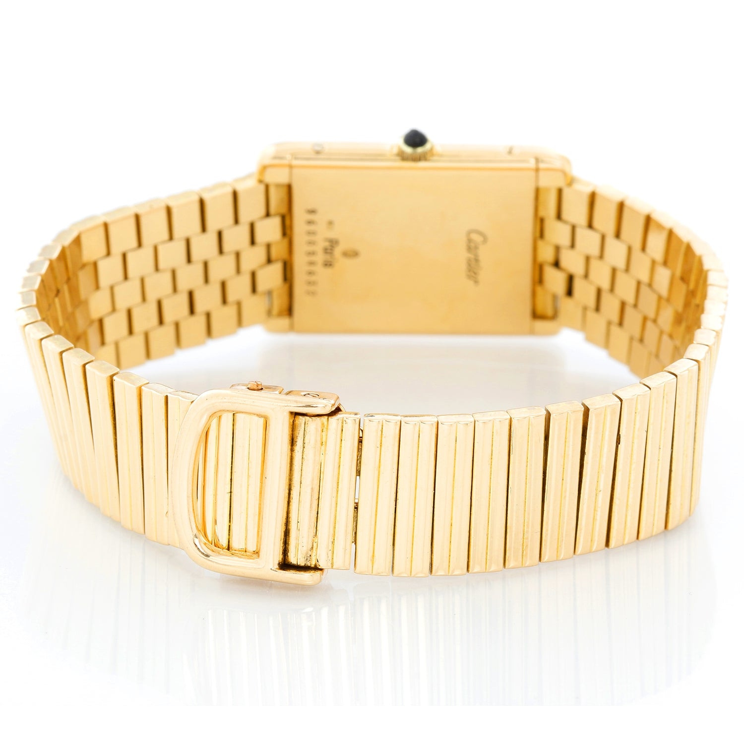Very Rare Cartier Tank Paris 18K Yellow Gold Watch - Manual. 18K Yellow Gold ( 26 x 34 mm ). Ivory dial with black Roman numerals. 18K Yellow gold integrated bracelet with deployant clasp; can be sized. Can fit up to a 7 inch wrist. Pre-owned with Cartier box. Very rare bracelet. The first one we have ever seen .