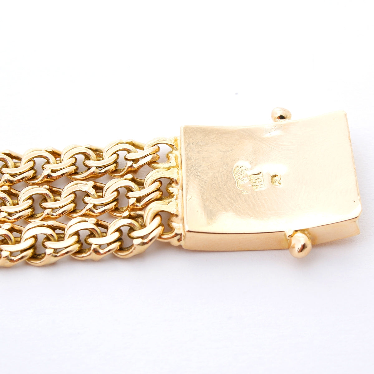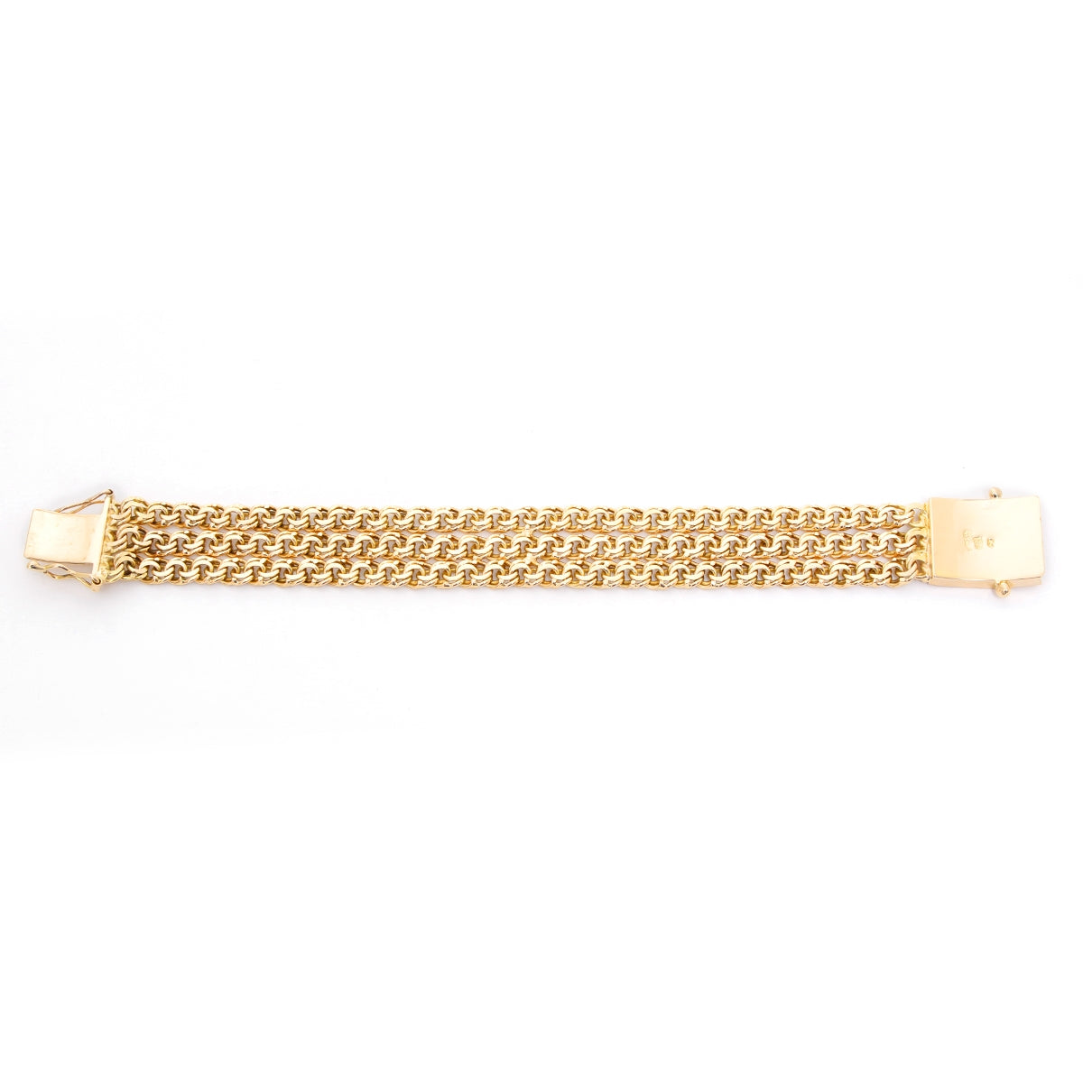 This chic vintage bracelet consist of three strands of a double fancy link chain with an oversized box link clasp. It is apx. 7-1/2 inches in length with a total weight of 54.0 grams. Stamped 18K. This bracelet is perfect for any look!
