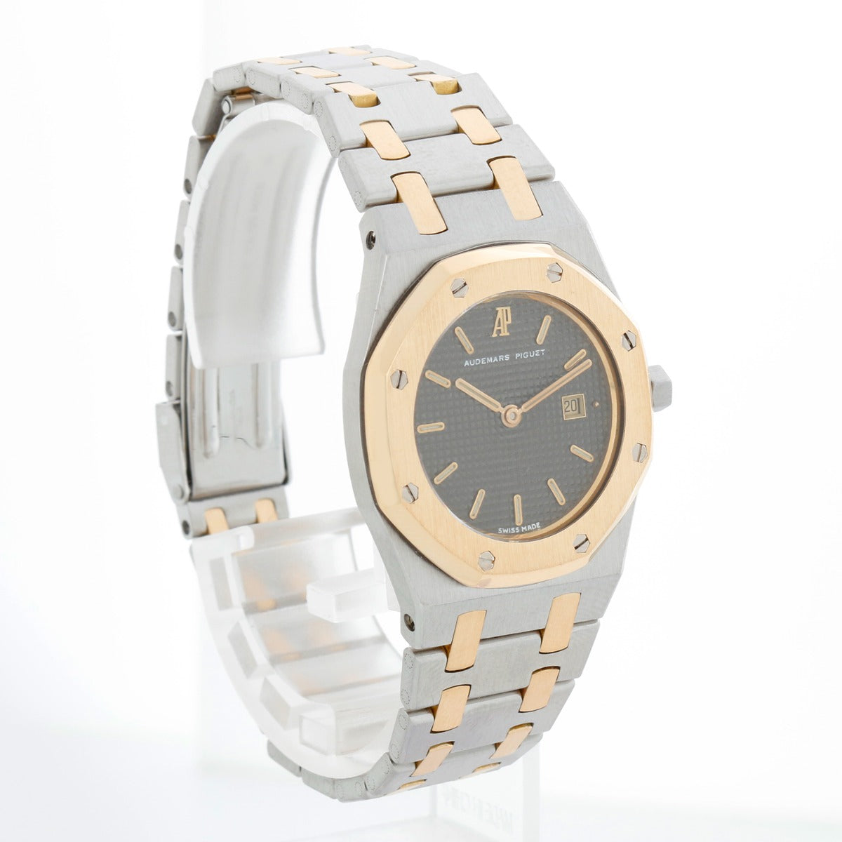 Vintage Audemars Piguet Royal Oak Ladies Watch - Quartz. Stainless Steel ( 29 mm ) with a yellow gold bezel. Grey Tapisserie with hour markers. Stainless steel and Yellow Gold bracelet with Deployant clasp; will fit up to a 7 inch wrist. Pre-owned with custom box.