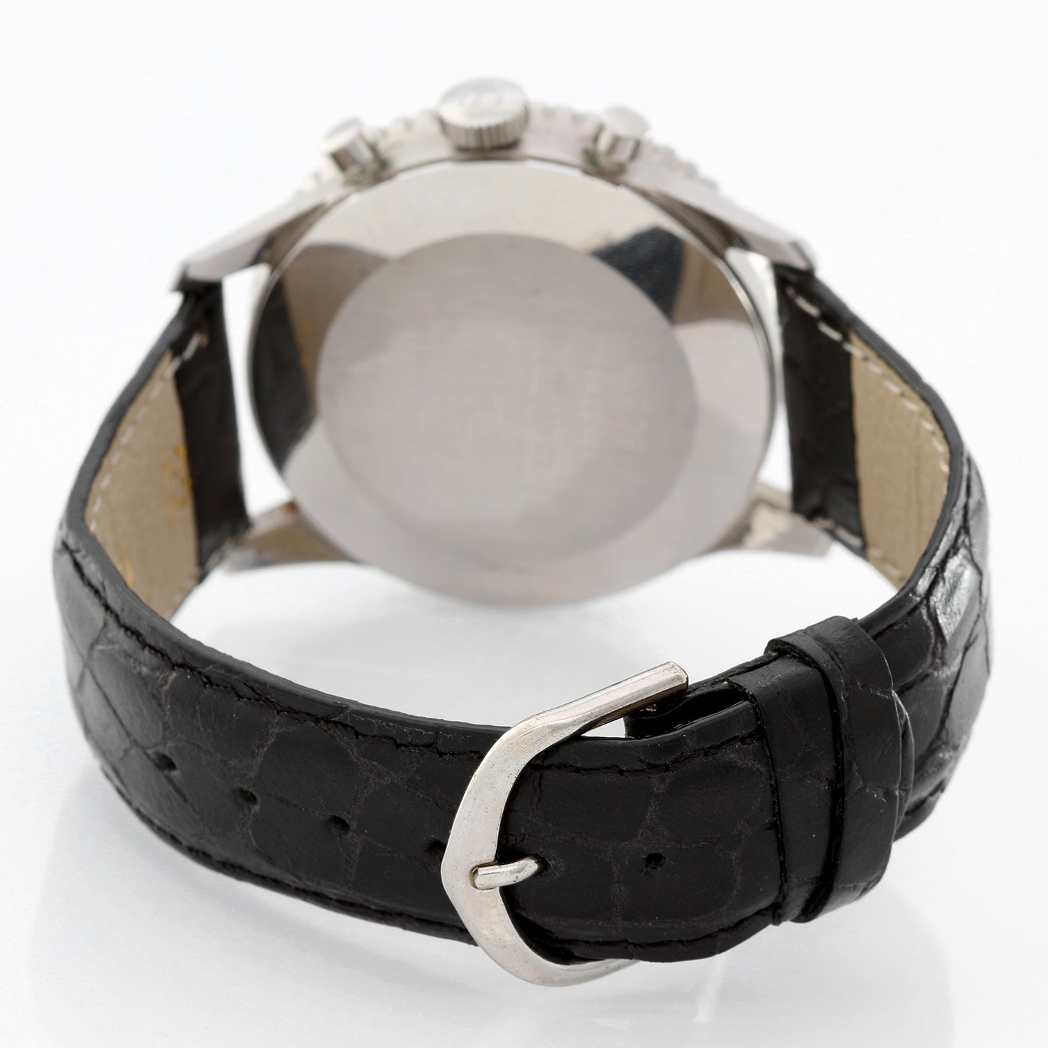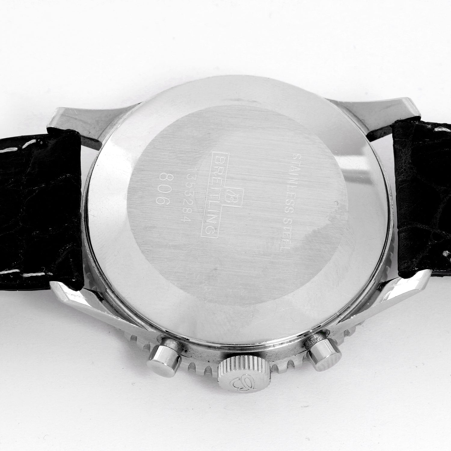 Vintage Breitling Navitimer Men's Steel Chronograph Watch 806 - Manual winding chronograph. Stainless steel case (40mm diameter); unpolished. Beautiful mint original black dial with silver subdials. Black leather strap band and stainless steel buckle. Pre-owned with original Breitling box and original instruction book in French. Original warranty papers. Also included is original Breitling strap and buckle. This is a very collectible vintage Navitimer ca. 1950's/60's. Best one we have ever seen.
