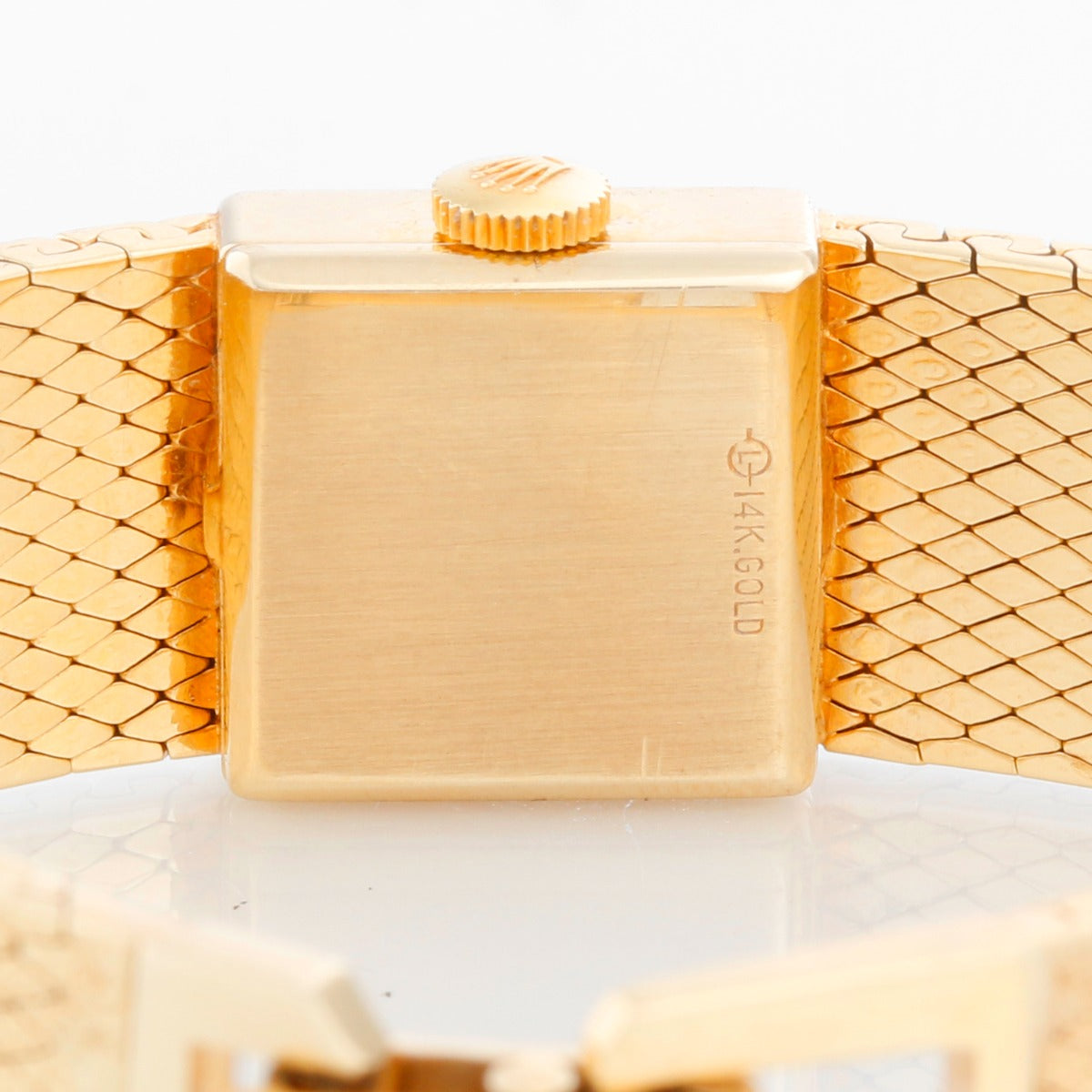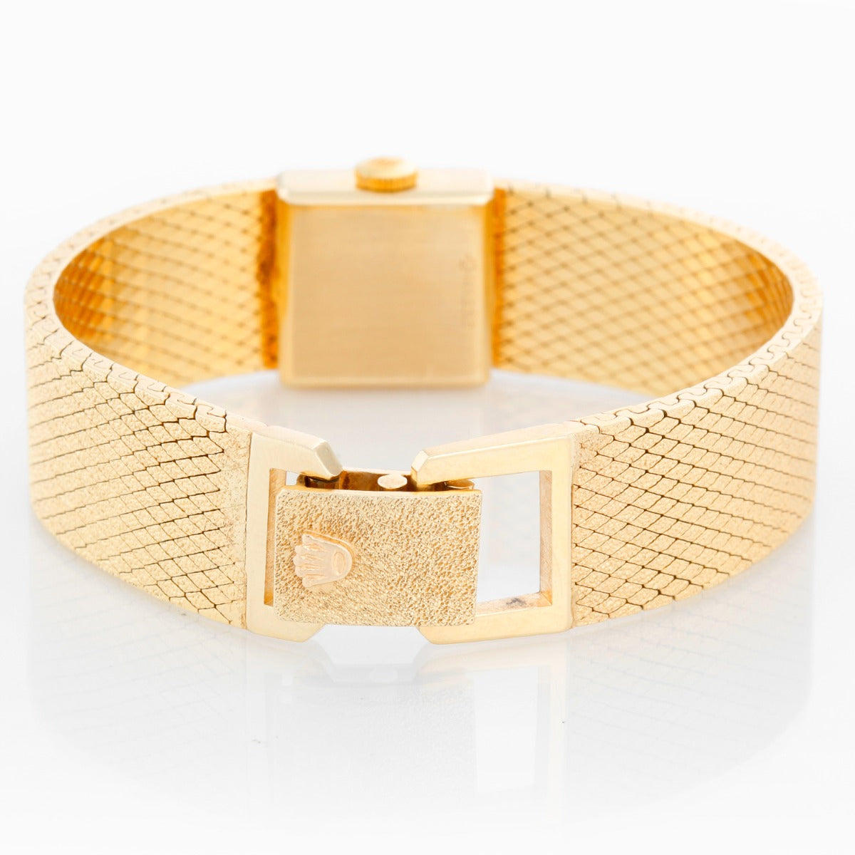 Vintage Ladies 14k Yellow Gold Square Ladies Watch on Mesh Bracelet - Manual winding. 14k yellow gold case (15mm x 15mm). Silver dial with stick markers. 14k yellow gold integrated mesh bracelet with Rolex crown on clasp (will fit apx. 5-3/4 in. wrist). Pre-owned with Rolex box
