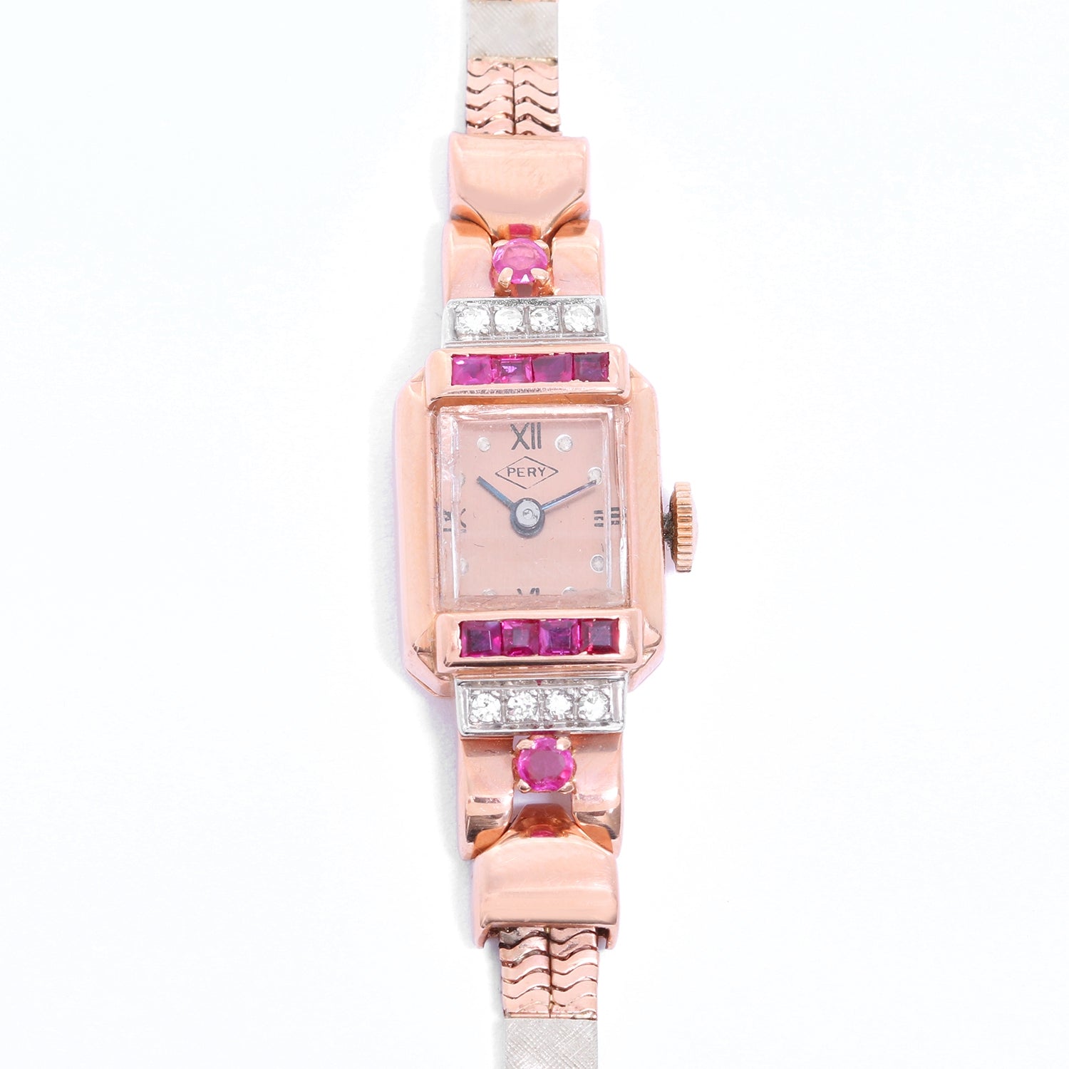 Vintage Ladies Rose Gold (Diamond/Ruby) Pery watch - Manual winding. Rose gold ( 13 x 25 mm ). Rose gold dial with Roman numeral markers. Art deco rose gold bracelet; will fit a 5 3/4 inch wrist . Pre-owned with custom box.