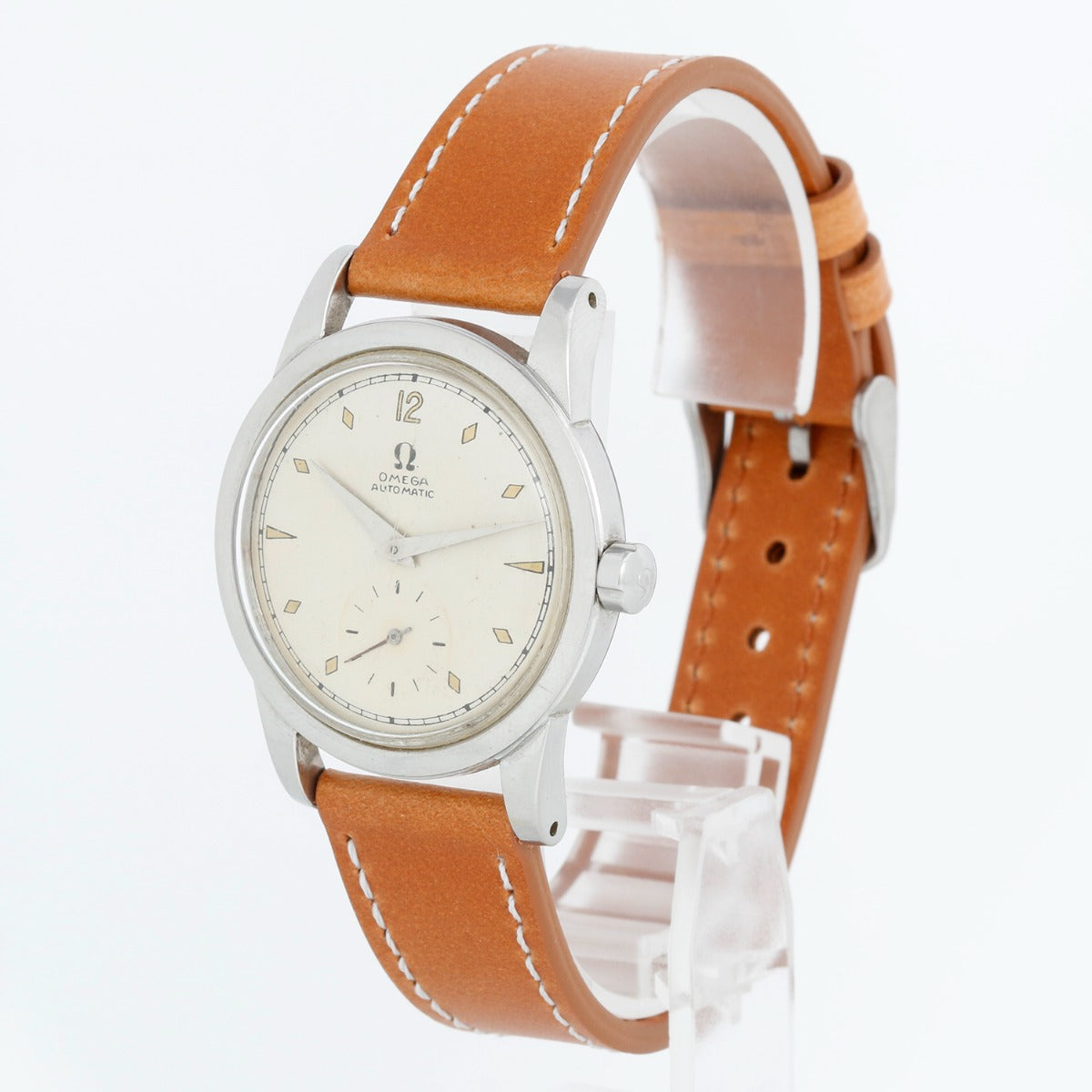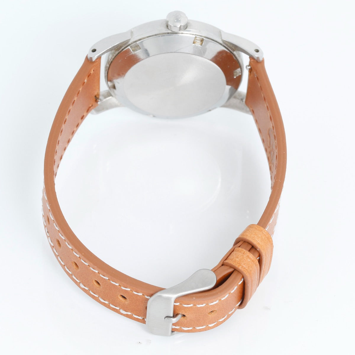 Vintage Omega Men Automatic Seamaster Watch Ref 2491-1 - Automatic. Stainless Steel ( 34 mm ). Silver dial with diamond shape hour markers. New tan Strap with Tangle buckle. Pre-owned with custom box.