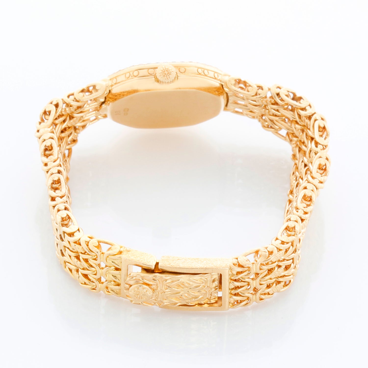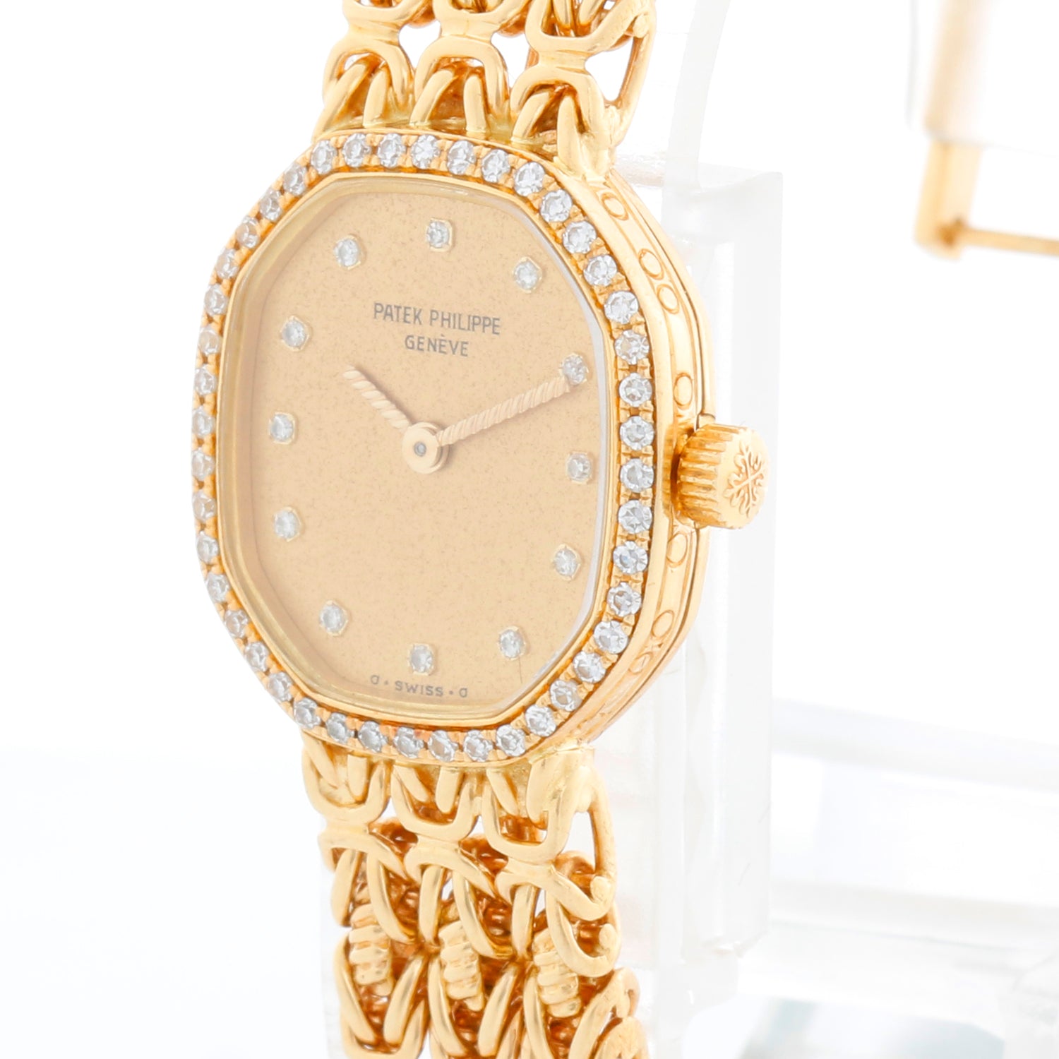 Vintage Patek Philippe 18k Yellow Gold Ladies Watch Ref. 4581-3 - Manual winding. 18k yellow gold case with diamond bezel (19mm x 21mm ). Champagne dial with diamond hour markers. Mesh 18K Yellow gold bracelet; will fit up to a 5 3/4 inch bracelet. Pre-owned with Patek Philippe box.