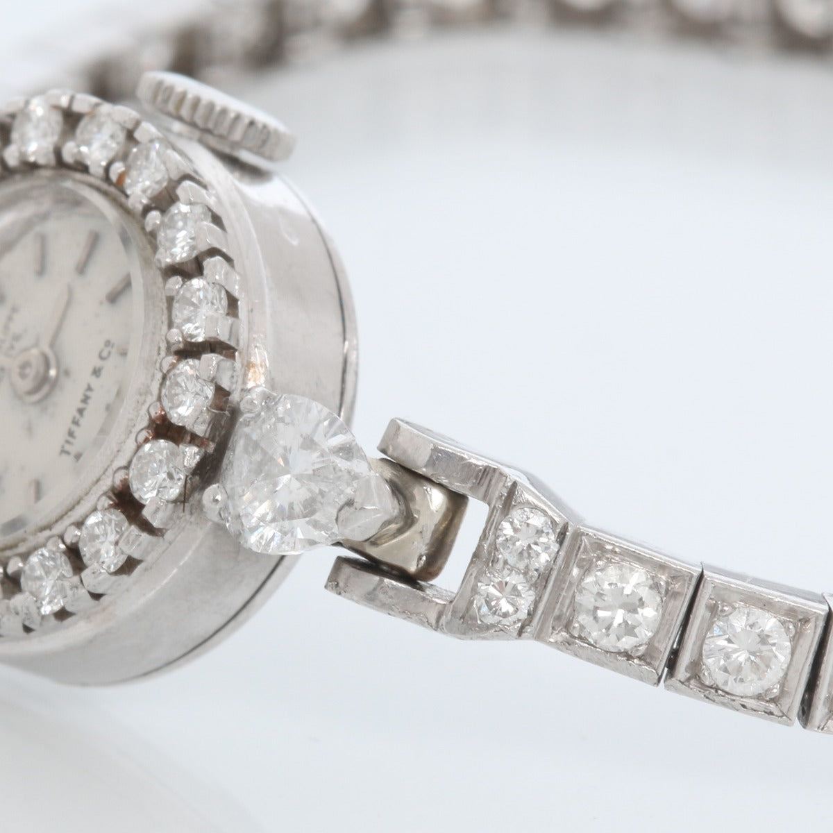 Patek Philippe 3267/1 Platinum & Diamond Ladies Cocktail Watch - Manual winding; movement signed Patek Philippe. Platinum case with diamond bezel & pear shaped diamond lug ( 15 mm). Ivory dial with stick hour markers signed Patek Philippe & Tiffany & co.. Platinum Tennis bracelet signed by Tiffany & Co.; will fit up to a 6 1/4 inch wrist. Pre-owned with Tiffany box. Very RARE 1950's.