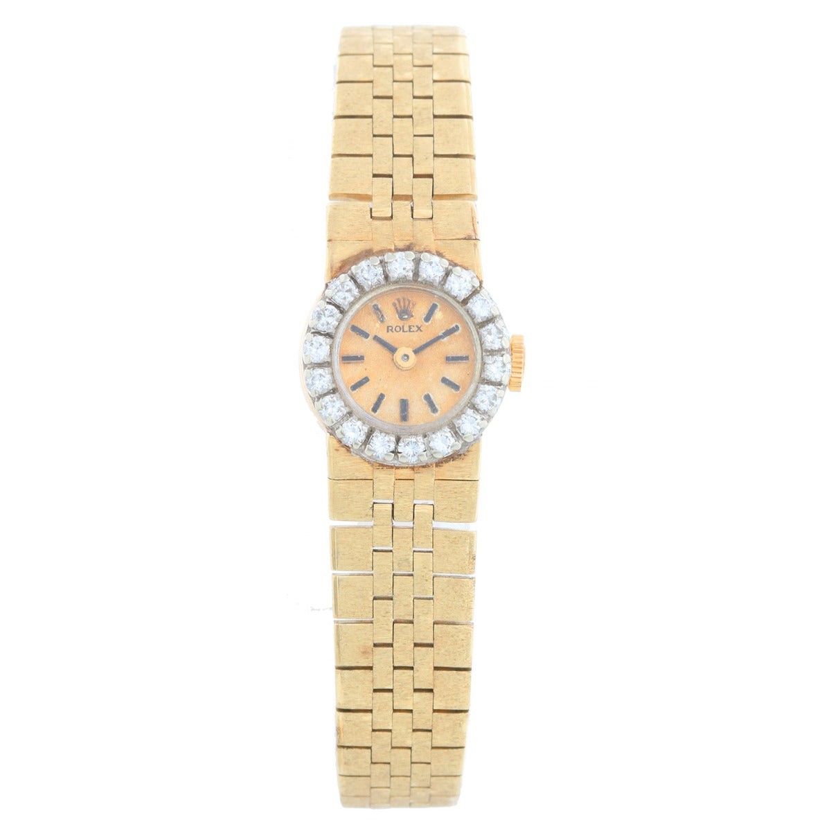 Vintage Rolex Ladies 14K Yellow Gold Watch Ref 8374 - Manual winding . 14K Yellow gold dial with diamond bezel ( 15 mm). Champagne texture dial with stick hour markers. 14K Yellow gold bracelet; will fit up to a 6 1/4 inch wrist. Pre-owned with custom box.