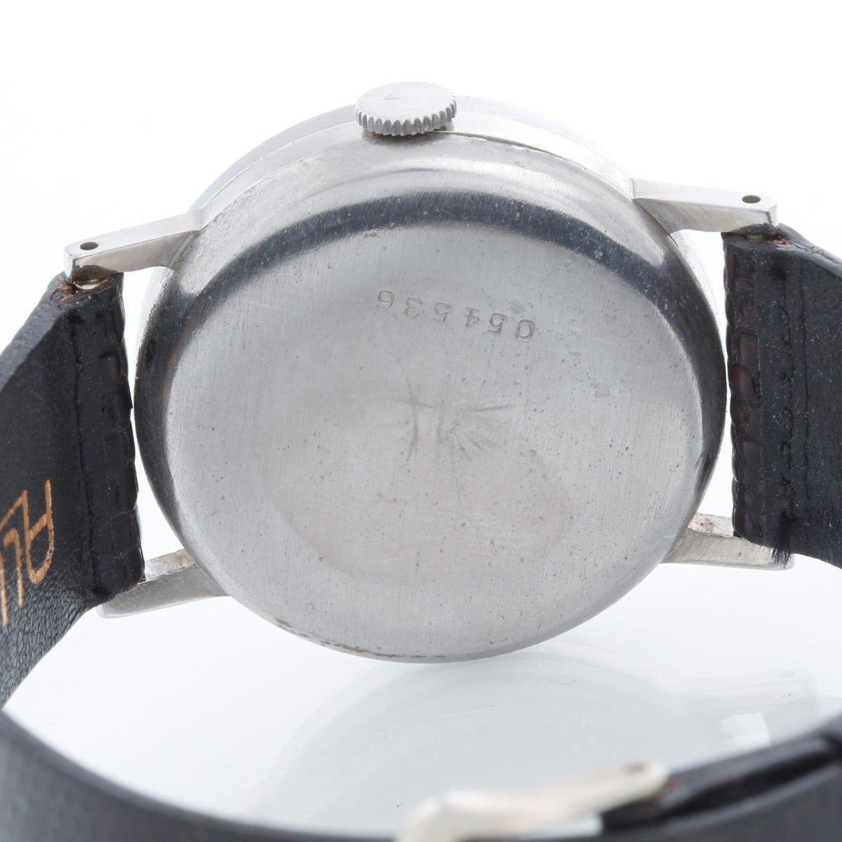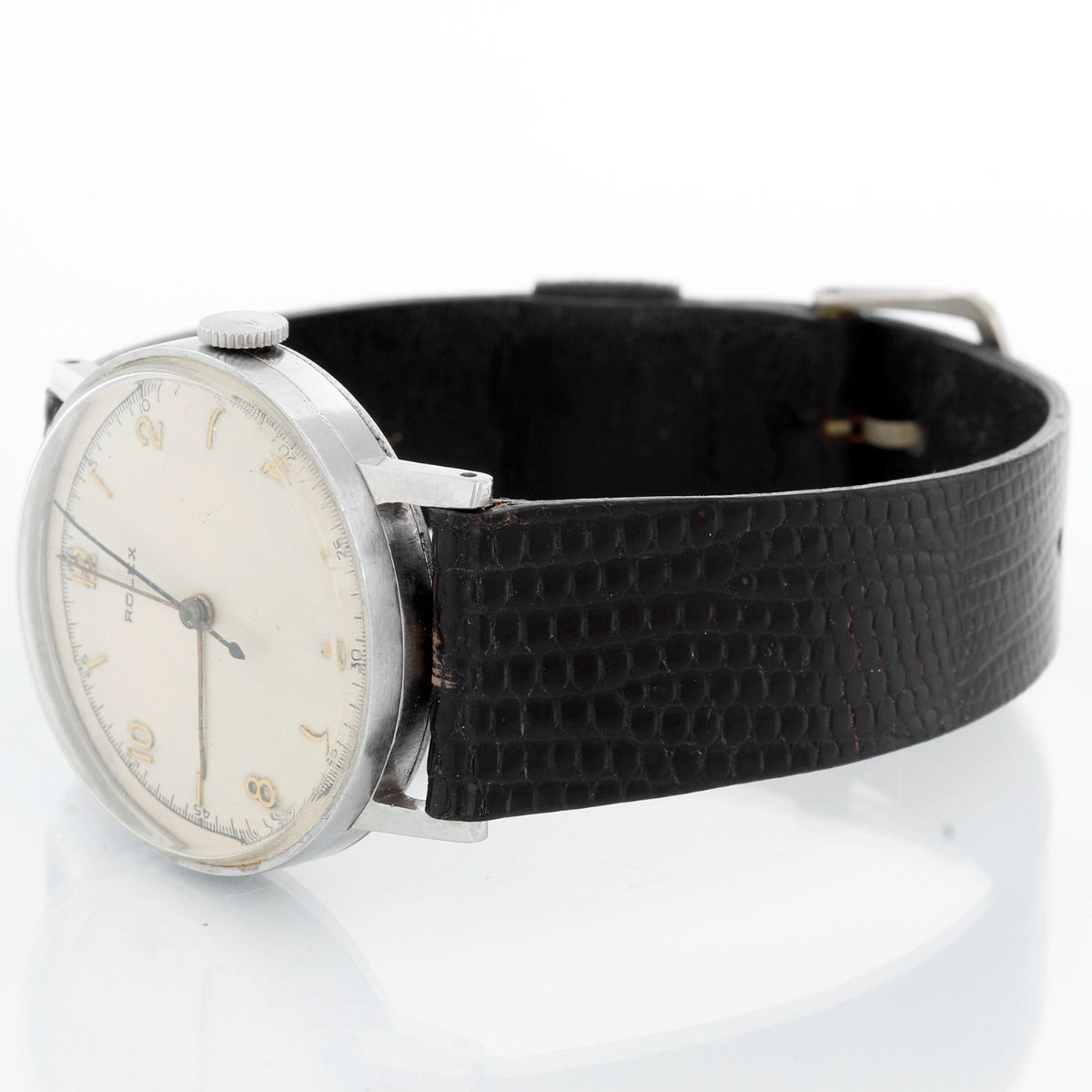 Vintage Rolex Men's Stainless Steel Watch - Manual winding. Stainless steel case (33mm diameter). Cream dial with stick and Arabic numerals. Black lizard strap with tang buckle. Pre-owned with custom box.