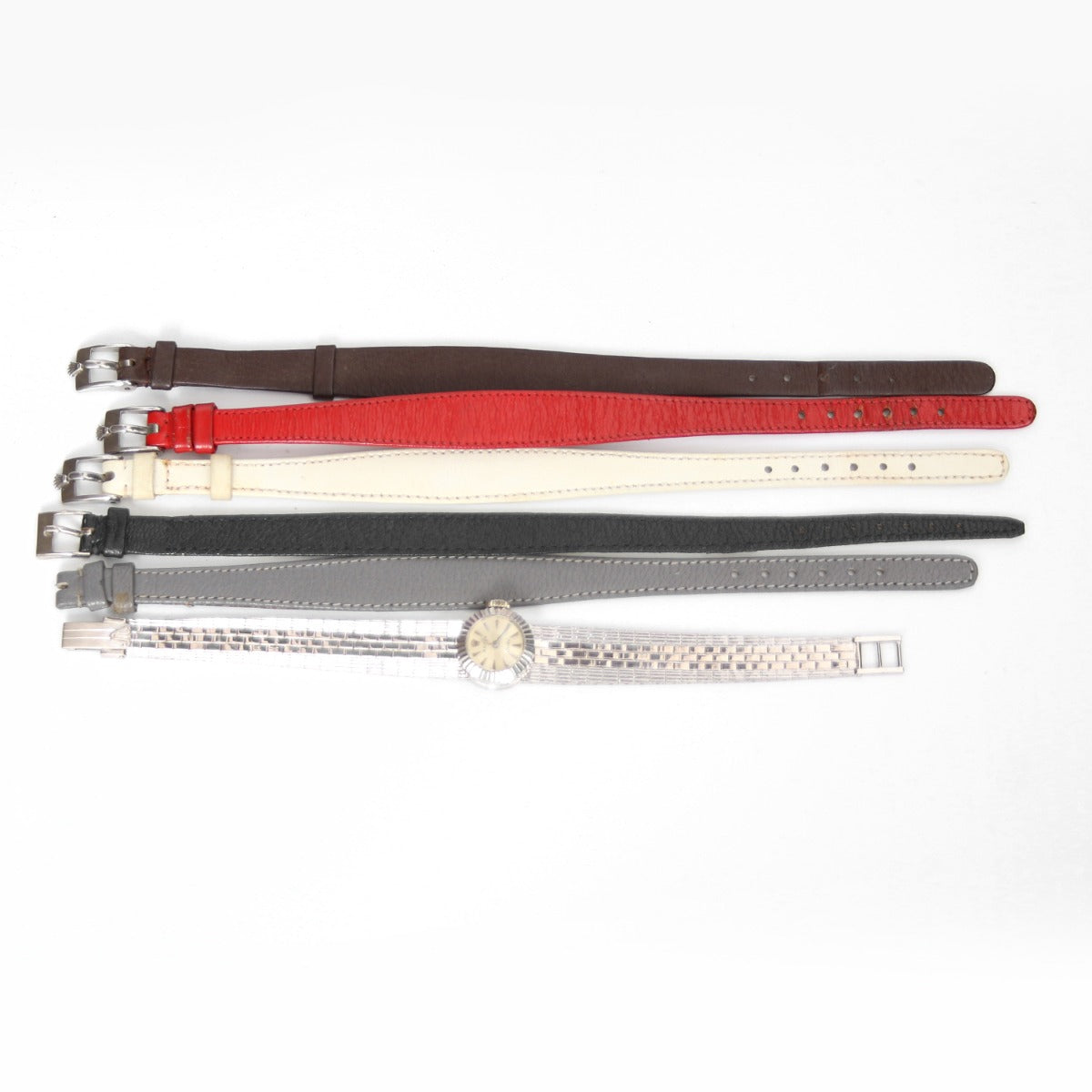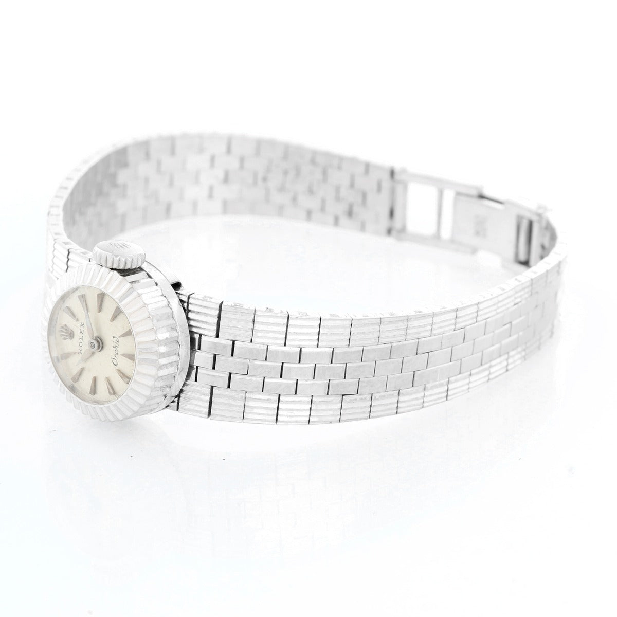 Vintage Rolex Orchid Chameleon 14K White Gold Ladies - Manual winding. 14K white gold case with slot through which bands can be interchanged (16 mm). Silver textured dial with gold stick markers. White gold bracelet measuring 6.5 inches. Pre-owned with custom box and extra straps. Extremely rare model.