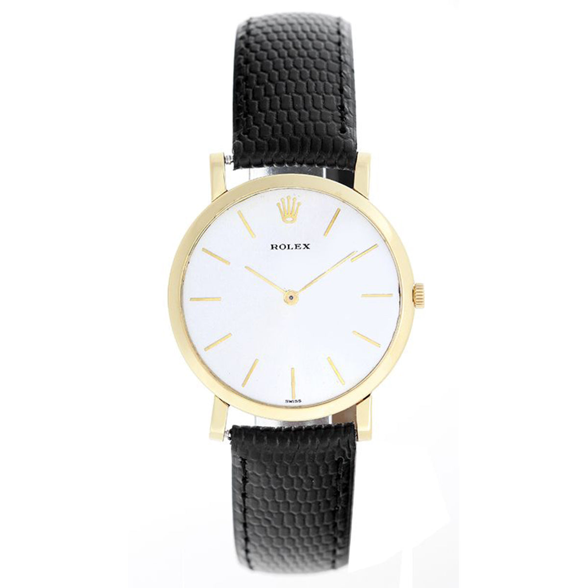 Vintage Ultra Thin Rolex Ref. 9490 Men's 18k Yellow Gold Watch - Manual winding; 18 jewels, M. Cal. 650. 18k yellow gold case (31mm diameter; 5.5mm thickness). Silver dial with gold stick markers. Strap band. Pre-owned with custom box.