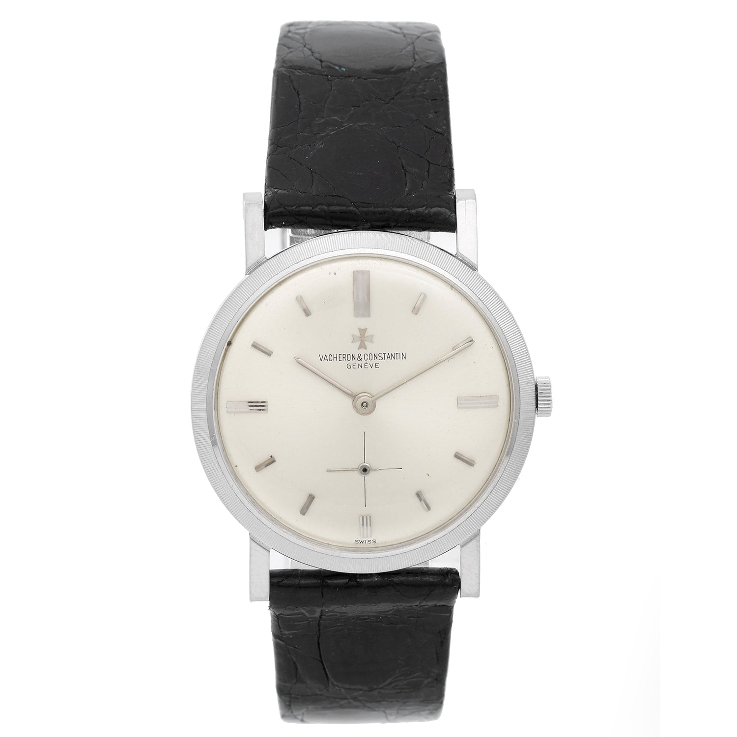 Vintage Vacheron Constantin 18k White Gold Men's Watch - Manual winding. 18k white gold case (32mm diameter). Silver dial with stick markers. Vacheron Constantin black leather strap band with white gold buckle . Vintage, pre-owned, with custom box.