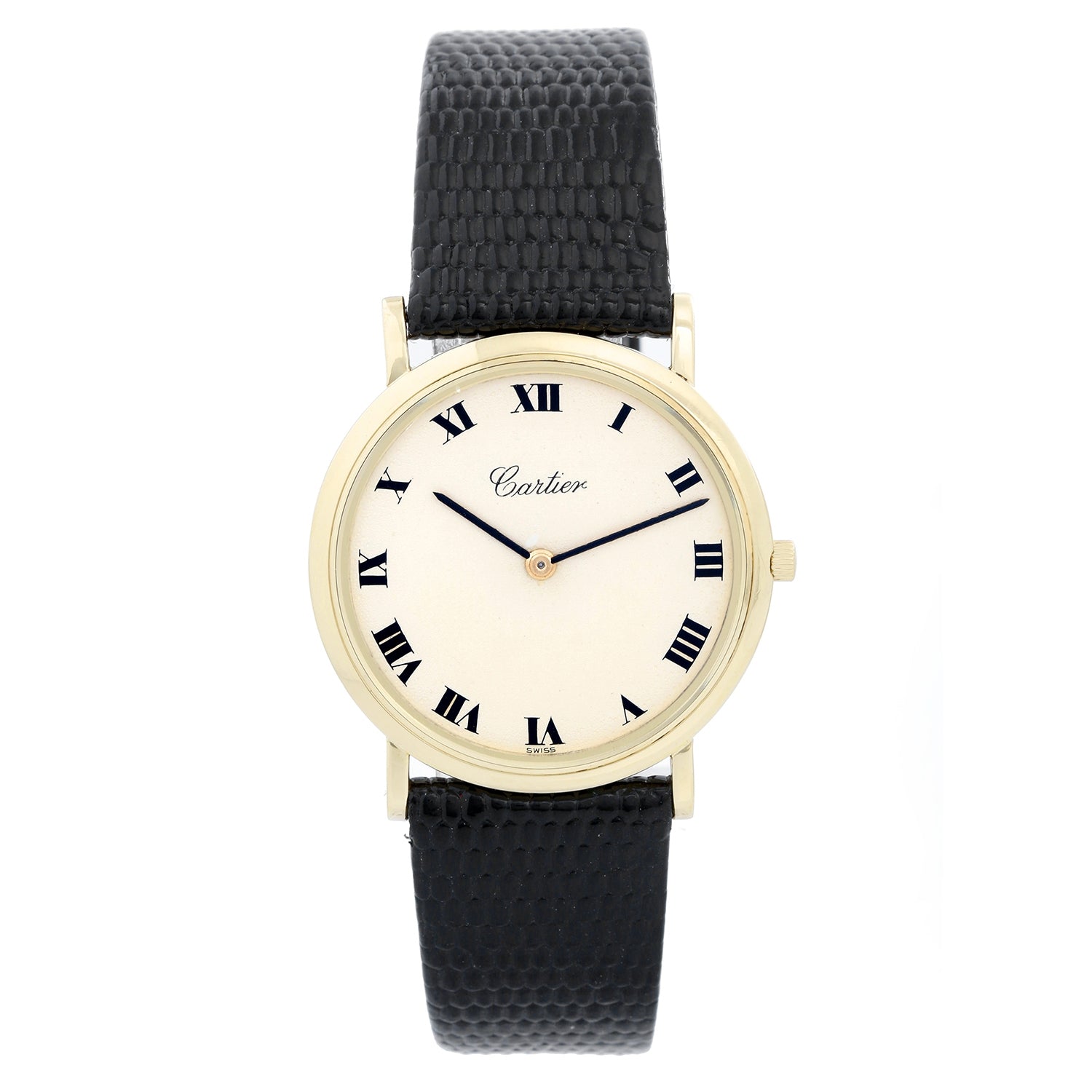 Vintage Very Rare Audemars Piguet Retail by Cartier Yellow Gold Manual Watch - Manual winding; movement by Audemars Piguet. 18K Yellow gold ( 32 mm ) Hand stamped Cartier numbers on case lug. Silvered dial with Roman numerals. Black lizard strap with tang buckle. Pre-owned with custom box. Circa 1960's-70's