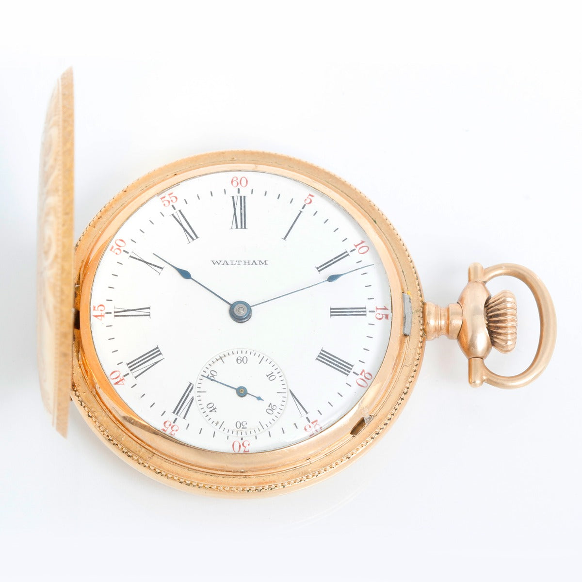 Waltham Antique 17 Jewels Large Mens Gold Filled Pocket Watch - Manual winding; 17 Jewels. Gold filled ( 51 mm ) With Blank Monogram Shield; Ornately Engraved. White dial with Roman numerals and subdial at 6 o'clock. Pre-owned with custom box. Estimated production date :1907