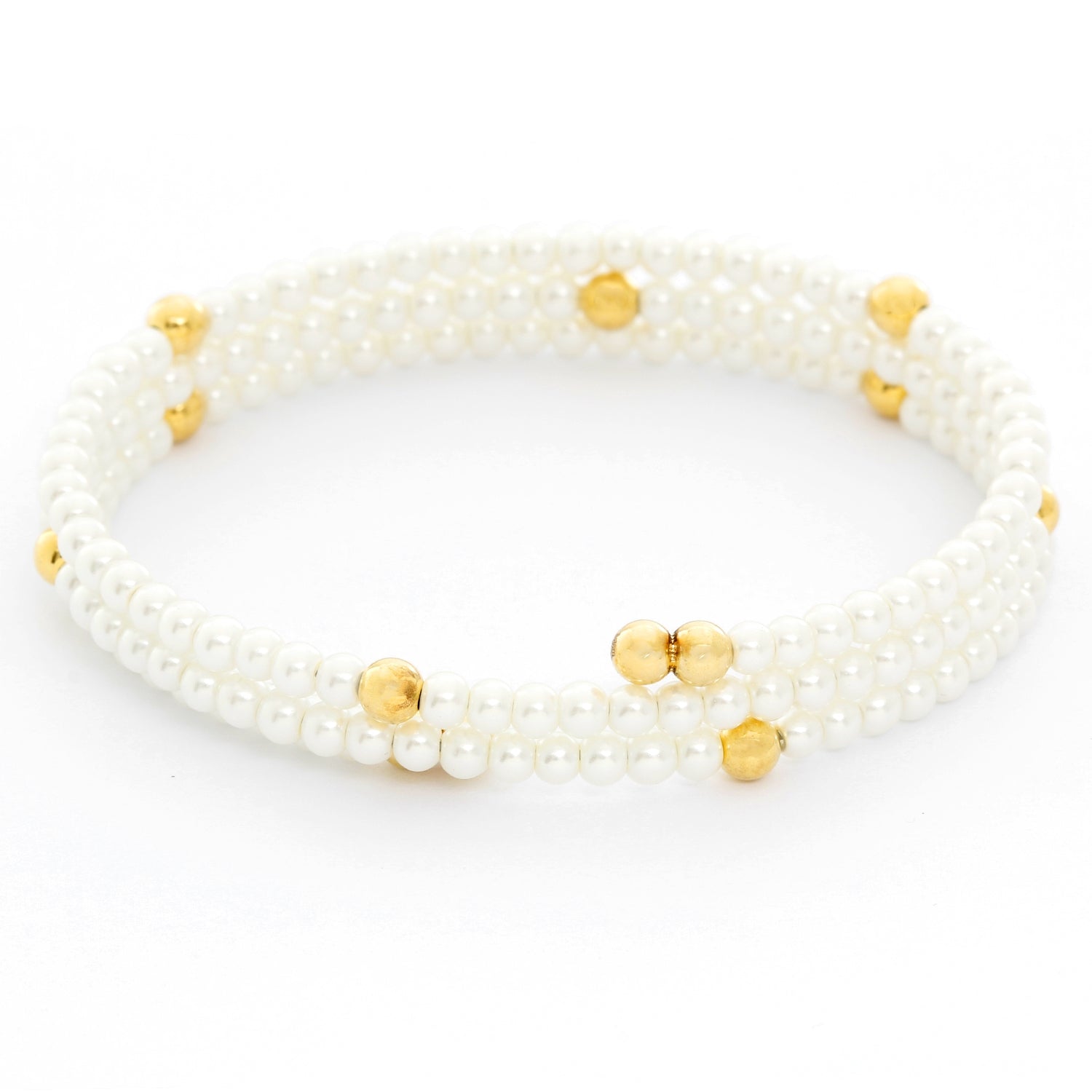 White Pearl Glass Bead Bracelet - Gorgeous wrap cuff bracelet with 3 strands of 3mm white pearls and 4mm gold accent beads. Bracelet measures 6.5 inches but offers stretch for larger wrists. New with DeMesy box.