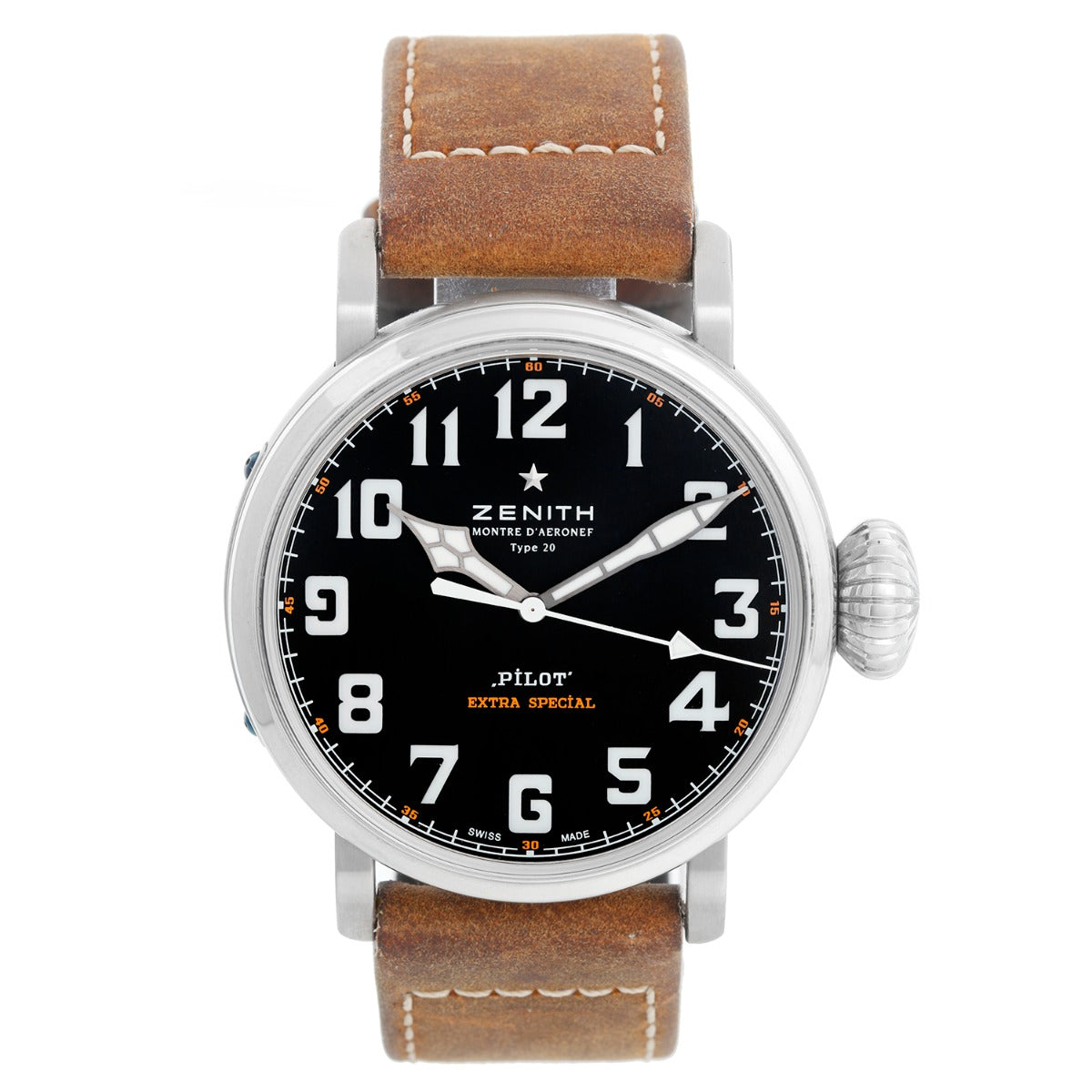 Zenith Pilot Type 20 Extra Special Stainless Steel Mens Watch - Automatic. Stainless Steel (45mm). Black dial with Arabic numerals; Minute Markers around the outer rim. Zenith Tan leather strap with tang Zenith buckle. Pre-owned with Zenith box and papers.